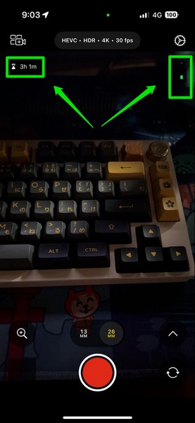 除了這些按鈕之外,您還會發現2 通知者放置在視頻預覽的右上角和左上角。右邊的是音頻電平通知器和左邊的一個表示使用當前設置拍攝的視頻填滿存儲空間之前剩餘的時間。