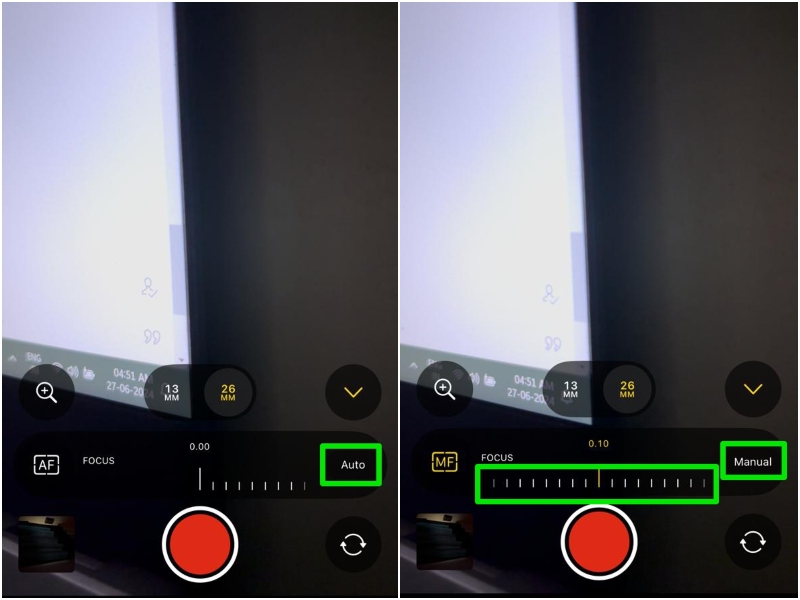 但是,如果您想在設備上使用 Final Cut Camera 應用程序時手動控制視頻鏡頭的焦點,您可以點按自動選項將其切換到右側手動模式或者只需使用滑塊自動切換到手動對焦。