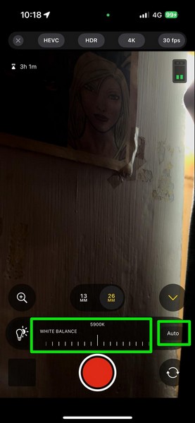 點擊白平衡按鈕將顯示白平衡滑塊你可以用它手動調整設置和查看實時效果在您的視頻預覽中。默認情況下,它設置為汽車和自動調整白平衡隨著環境照明隨場景的變化而變化。