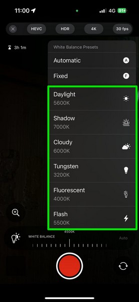 接下來是白平衡控制按鈕允許用戶調整或設置視頻的特定白平衡。視頻的白平衡將根據環境照明條件決定其整體色調。