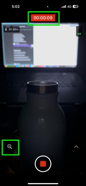 開始錄製視頻後,您將看到計時器從頂部開始在自己的空間中使用音頻電平和視頻限制通知器。你也會找到縮放控制按鈕在視頻預覽的左下角和點擊它即可訪問縮放滑塊。