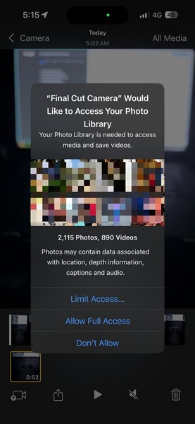 筆記:如果您是第一次在 iPhone 上使用 Final Cut Camera,則需要完全或部分允許該應用訪問您的照片庫。