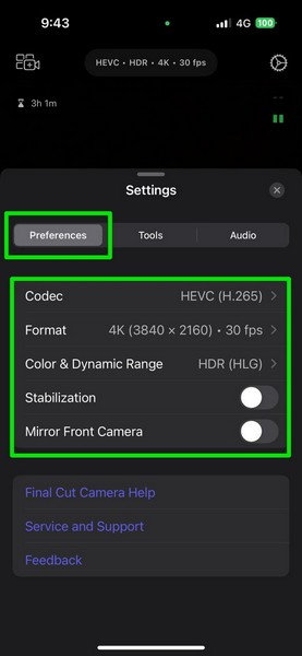 現在,在首選項選項卡在 iPhone 上 Final Cut Camera 應用程序的應用程序內設置菜單中,您可以調整上面菜單欄上的快速控制按鈕提供的所有視頻設置。此外,您還可以啟用/禁用穩定和鏡面前置攝像頭效果在首選項選項卡下。