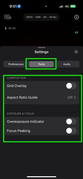 下工具選項卡, 你可以啟用/禁用網格覆蓋,如果您在拍攝視頻時遵循三分法則,這會很有用。此外,您還可以調整視頻的寬高比,啟用/禁用過度曝光指示器, 和峰值對焦。後兩個選項突出曝光過度的區域和視頻鏡頭中的聚焦對象。