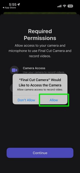 3.接下來,您將被要求啟用相機和麥克風訪問對於 Final Cut Camera 應用程序。點擊繼續按鈕。