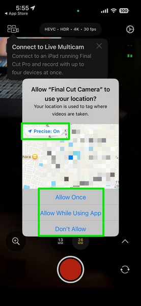 6.授予對 Final Cut Camera 應用程序的位置服務訪問權限將允許它對您錄製的視頻進行地理標記。因此,如果您希望對 Final Cut Camera 視頻進行地理標記,您可以切換精確選項並選擇使用應用程序時允許選項。