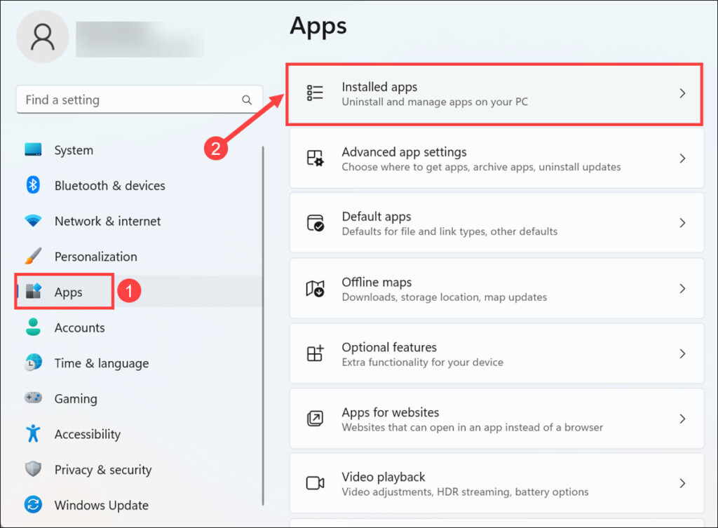 2.在設置窗口中,切換到應用程式左側菜單上的部分並選擇已安裝的應用程序在右側。