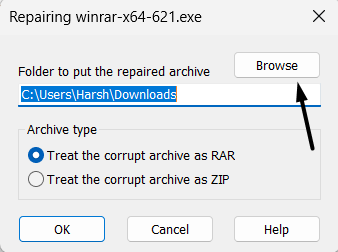 4.從中選擇損壞文件的類型檔案類型部分。您可以選擇將損壞的存檔視為 RAR和將損壞的存檔視為 ZIP。