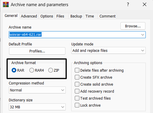 4.在中命名您的新存檔檔案名稱字段並選擇下面的存檔文件類型存檔格式。您可以選擇三種不同的文件類型:RAR、RAR4 和 ZIP。