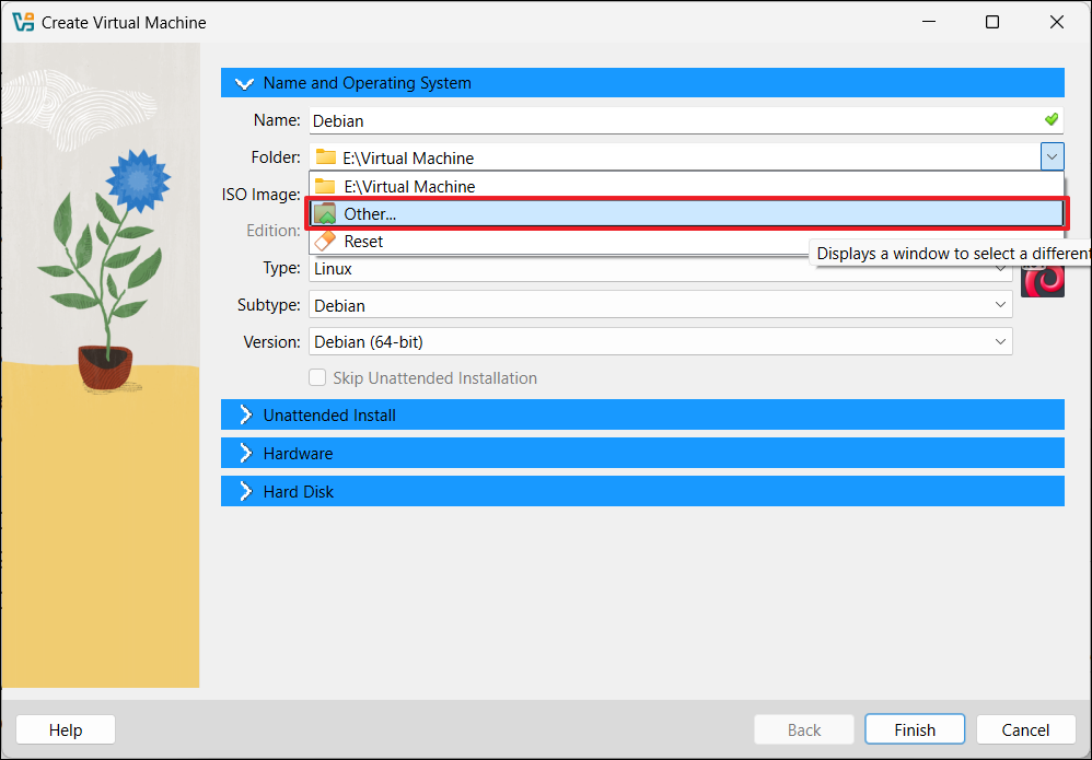 4. 選擇“其他”從“文件夾”下拉。然後,選擇要存儲虛擬機的位置。