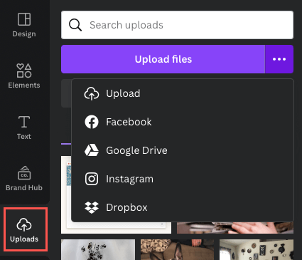 要上傳您自己的圖像,請選擇上傳在左側。使用右側的三個點上傳文件從您的計算機、Facebook、Google Drive、Instagram 或 Dropbox 中選擇一個。