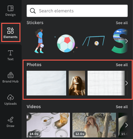 要使用 Canva 圖像,請選擇元素在左側。向下移動至照片並使用箭頭向右滾動或選擇查看全部一次查看更多圖像。