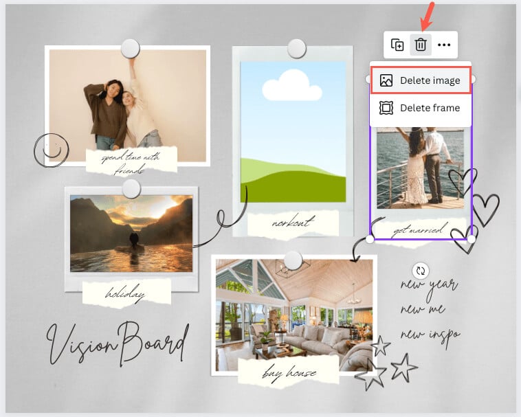 - 要交換圖像,請選擇板上的圖像並使用刪除圖標(垃圾桶)並選擇刪除圖像在浮動工具欄中。