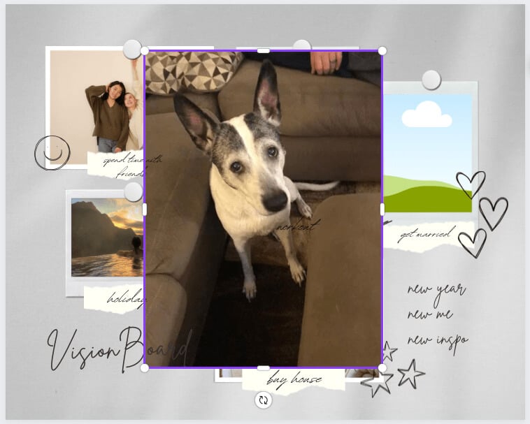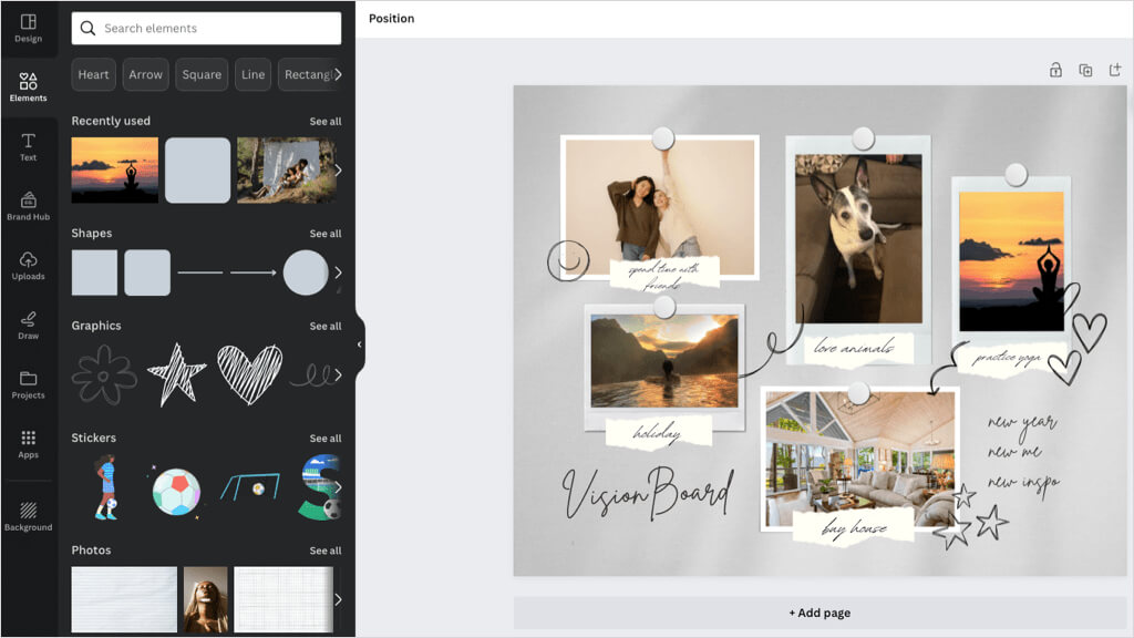 您可以將任何您喜歡的項目添加到您的願景板中,實際上,您應該這樣做。無論是其他圖像、貼紙或圖形,還是框架或形狀,都可以使用側邊欄中的 Canva 庫來選擇您想要的項目。然後,選擇或將其拖到板上。