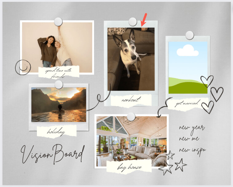 一個更有吸引力的建議是這個白灰色簡約願景板模板。讓這款產品脫穎而出的是手繪心形、星星和塗鴉的外觀。