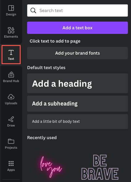 要添加更多文本,請選擇文字在側邊欄中。然後,您可以選擇樣式、字體組合,或者只是添加一個空框並輸入文本。