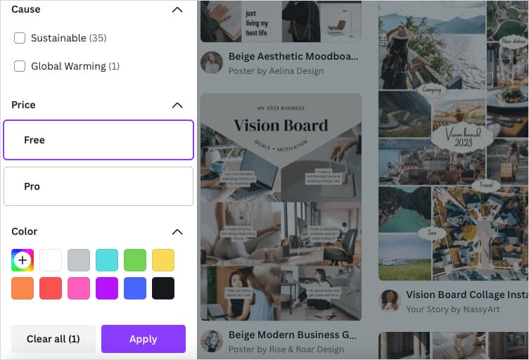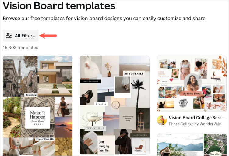 幸運的是,Canva 提供瞭如此多的免費願景板模板,您可能無需瀏覽整套模板就能看到您喜歡的模板。以下是如何查看模板集合併過濾選項。