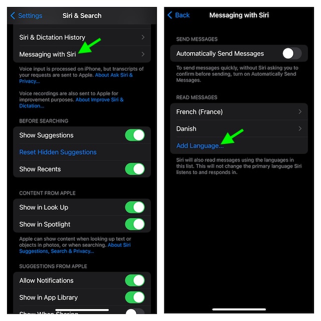 - 要刪除語言,請啟動 iOS/iPadOS 設備上的“設置”應用 -> Siri 和搜索 -> 使用 Siri 發送消息。