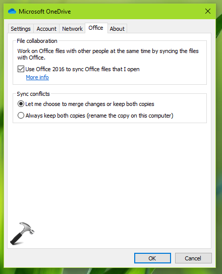 2.在下一個窗口中,切換到辦公室選項卡。在文件協作下,選中使用辦公室<Version>同步我打開的 Office 文件。然後在同步衝突下,選擇讓我選擇合併更改或保留兩個副本或選擇始終保留兩個副本(在此計算機上重命名副本)根據您的要求。
