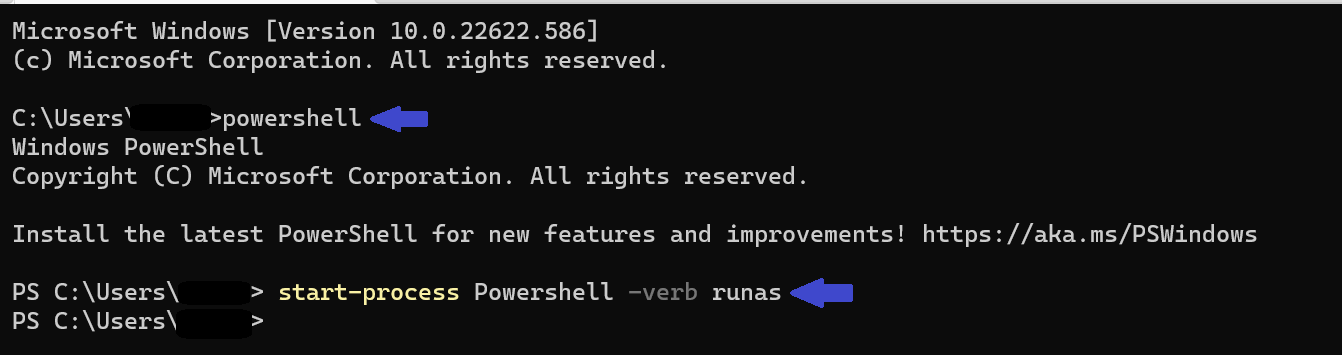 第 2 步:複製此命令“啟動進程 Powershell -verb runas”並將其粘貼到命令提示符中。按 Enter 鍵。