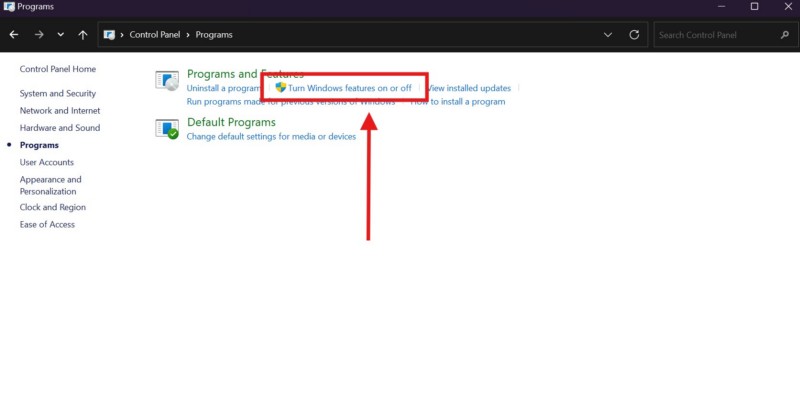 3.或者,您可以打開控制面板, 前往節目,然後選擇 T打開或關閉 Windows 功能選項根據程序和功能部分。