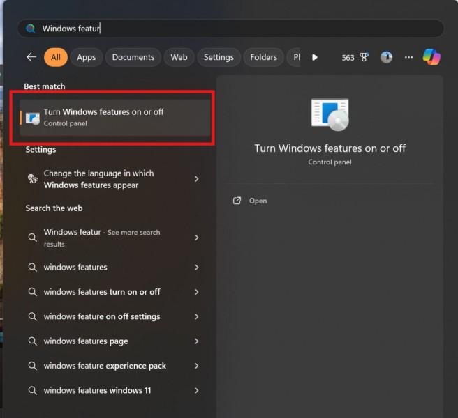 2.在文本框中輸入 Windows 功能,然後單擊打開或關閉 Windows 功能選項在搜索結果頁面上。