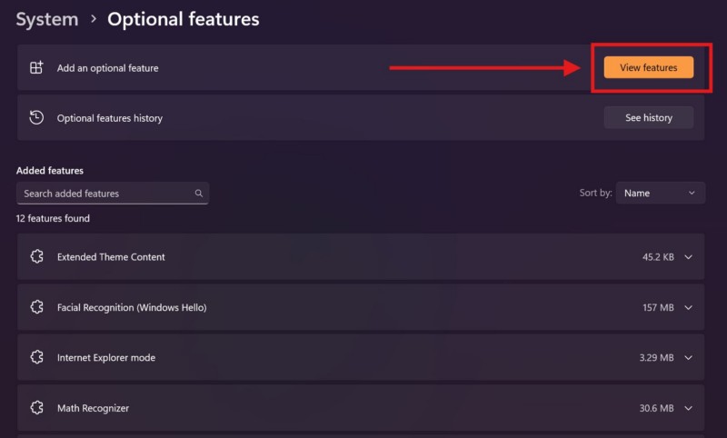 8.在接下來的頁面上,單擊查看功能按鈕旁邊的添加可選功能選項。