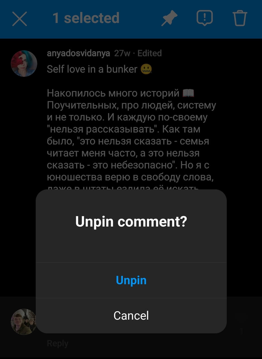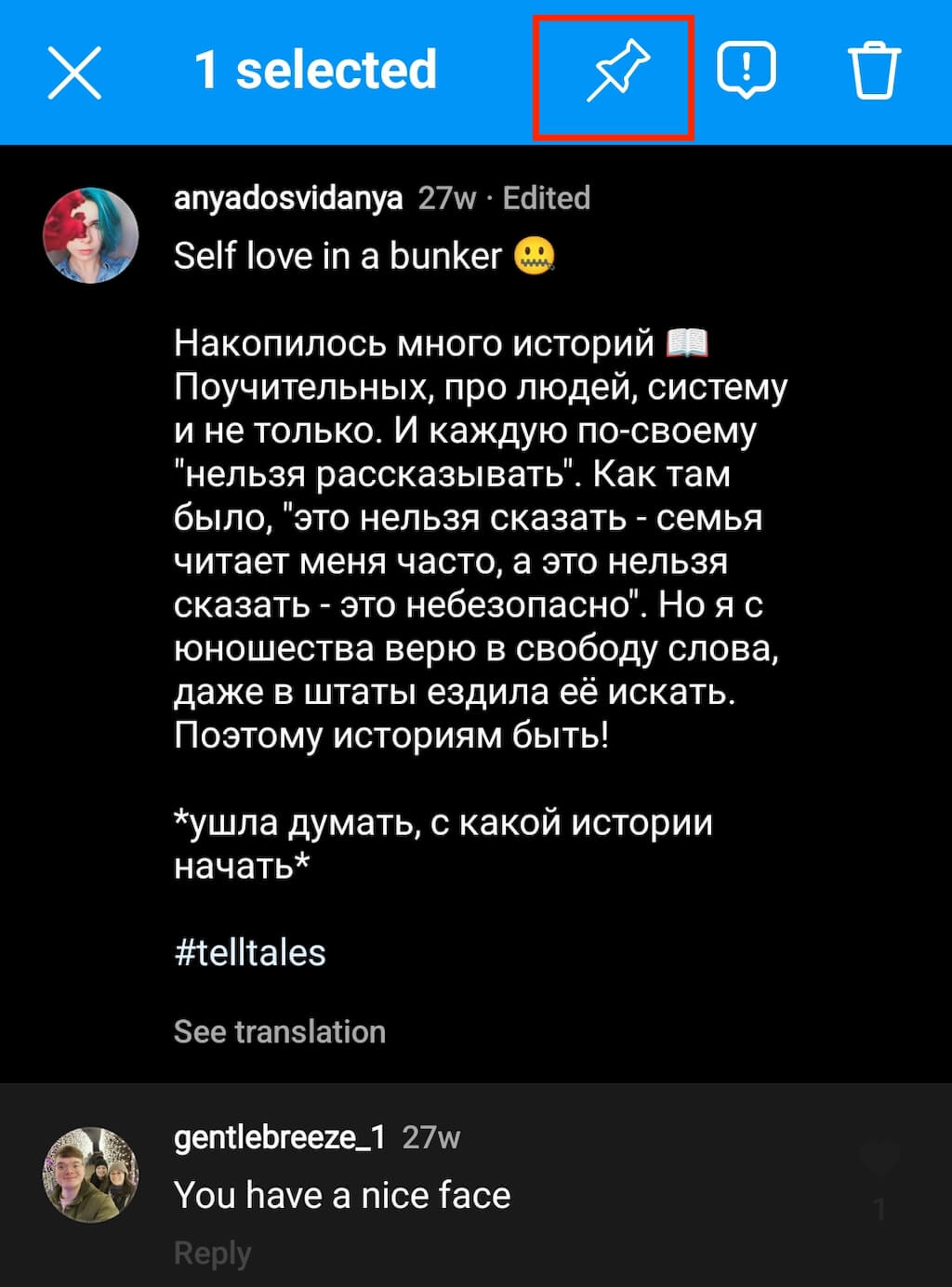 - 選擇圖釘圖標(或圖釘圖標)來固定評論。