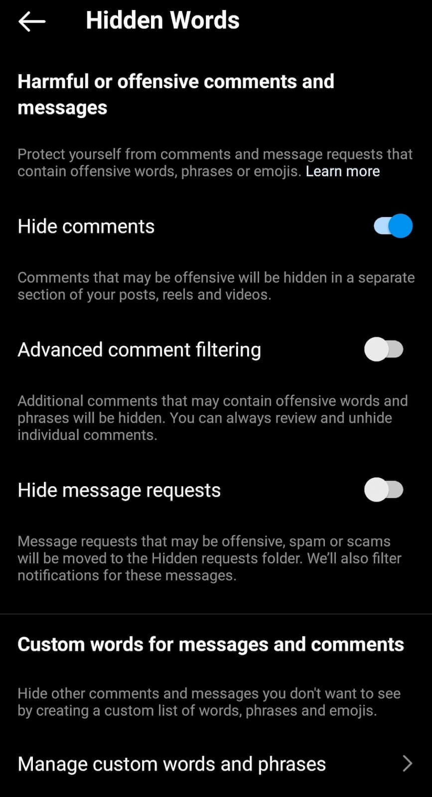 如果您想更進一步,請選擇管理自定義單詞和短語。在此部分中,您可以添加 Instagram 算法將從您的評論部分過濾掉的特定單詞、短語甚至表情符號。