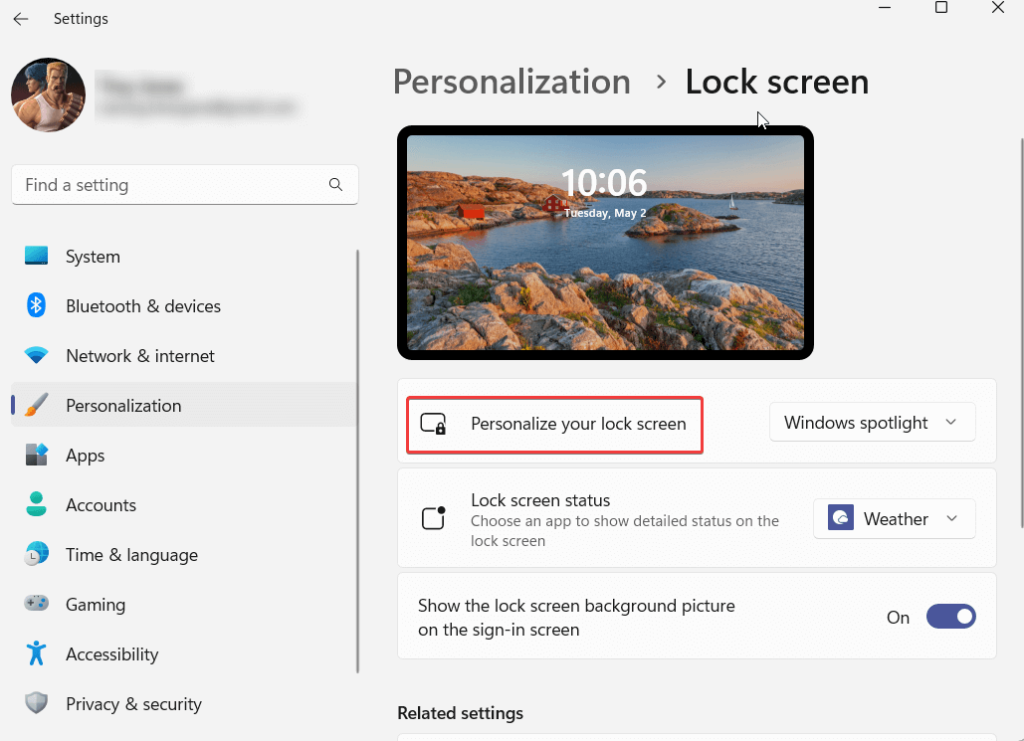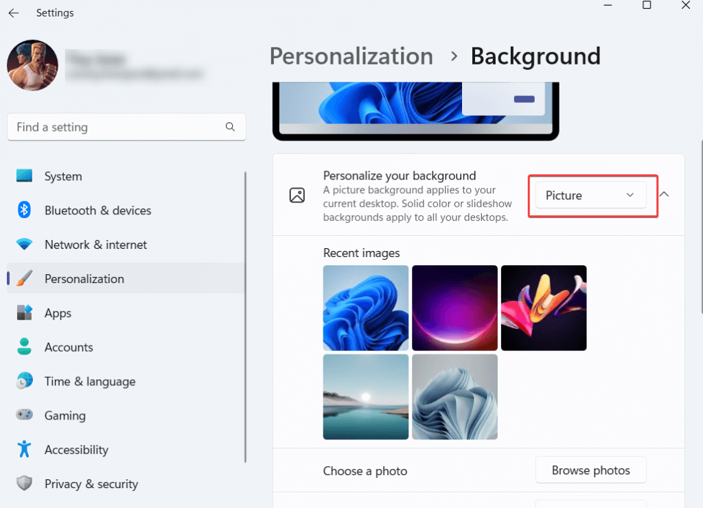 2. 單擊旁邊的下拉菜單個性化您的鎖屏並選擇圖片。