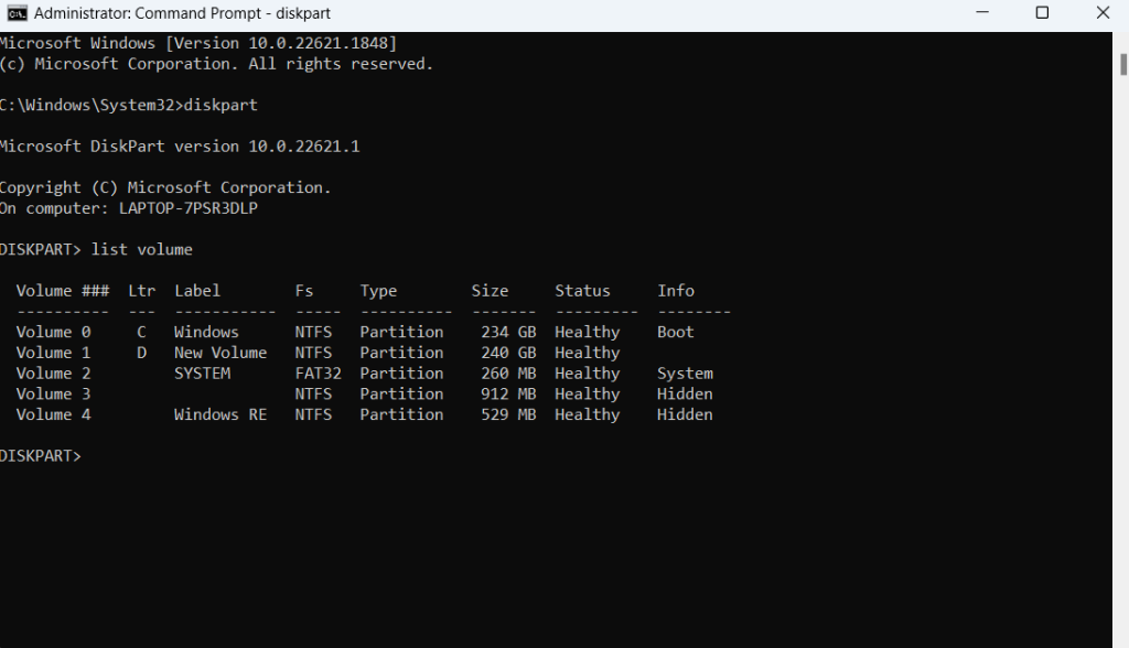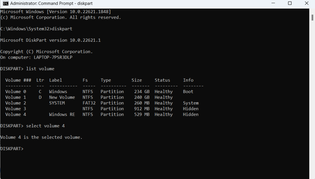 4. 類型選擇音量(卷號)。因此,例如,如果卷號 3 已變為 RAW,則命令將為 –選擇卷3。