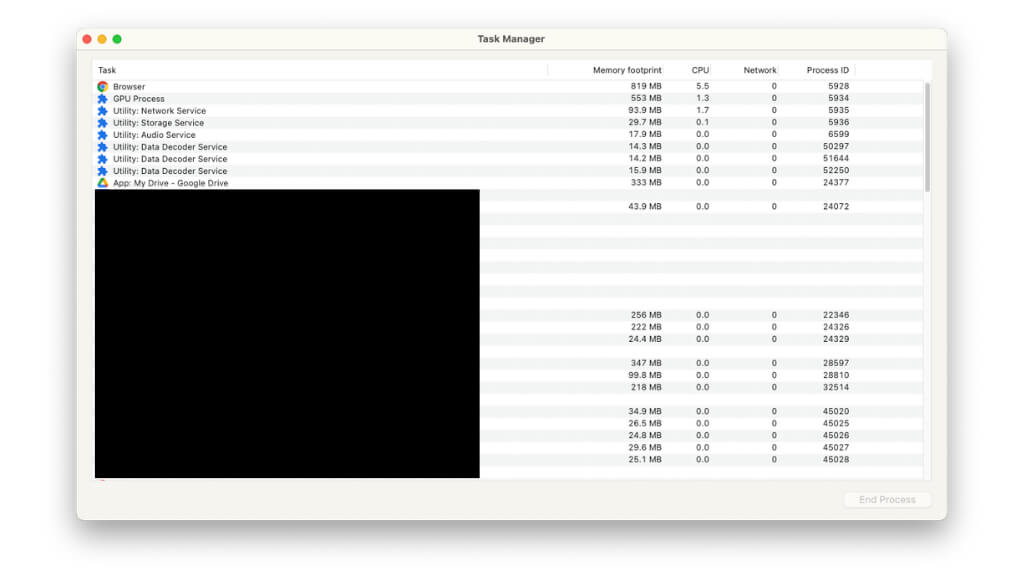 要了解 Chrome 是否佔用過多 CPU 資源,最快的方法是打開 Windows 中的任務管理器或 macOS 中的活動監視器。您可以在其中查看 Chrome 使用 CPU 的百分比。如果您不確定如何執行此操作,請查看我們有關 Windows 任務管理器的深入指南和有關 macOS 活動監視器的指南。