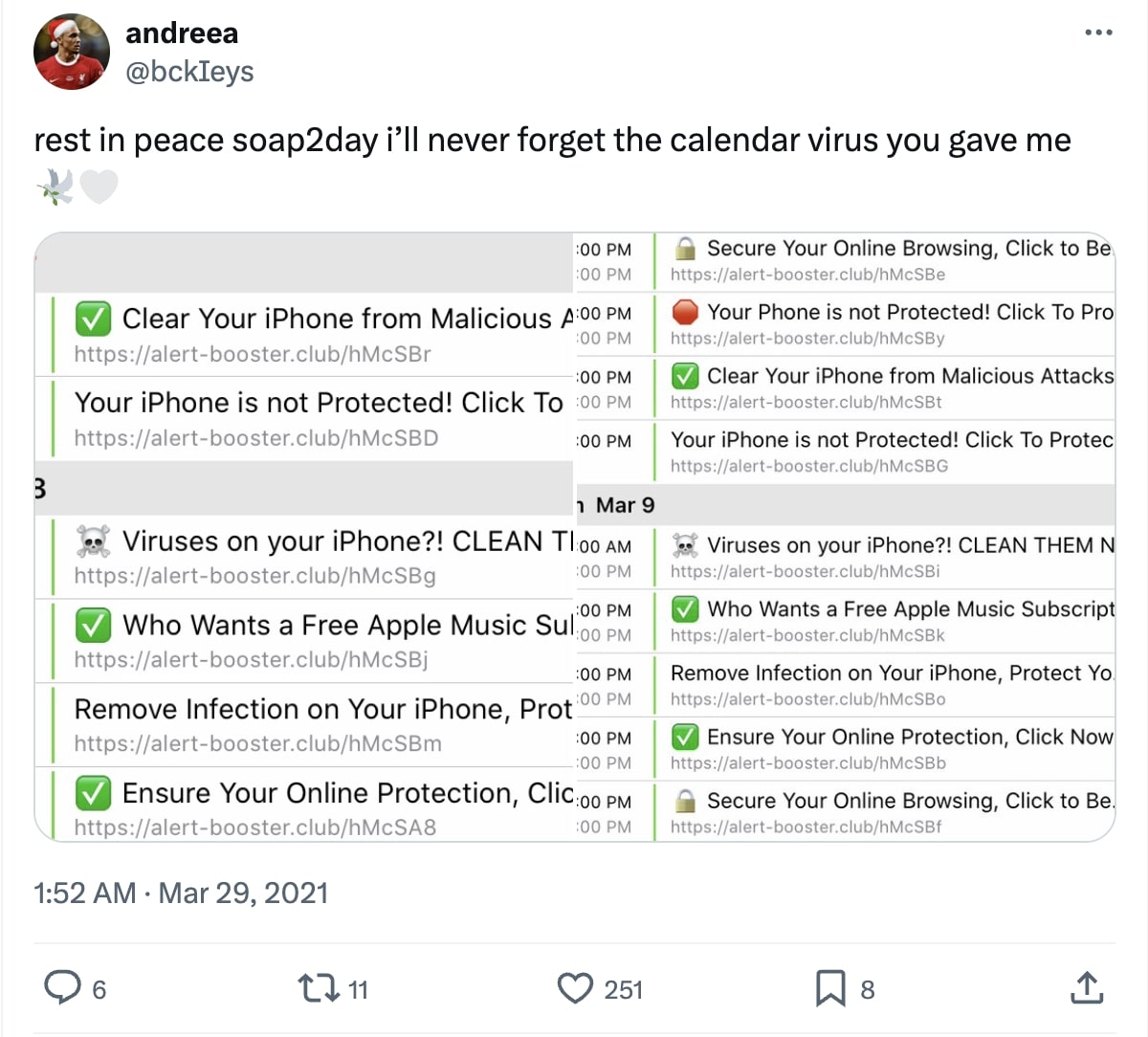 Soap2day 等網站可能會創建彈出窗口,聲稱您的 iPhone 已被感染,並提示您下載惡意文件,從而欺騙您。這些惡意文件通常包含日曆病毒,它會在您的 iPhone 上創建垃圾郵件日曆事件。