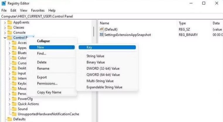 步驟一:在註冊表編輯器中右鍵單擊 HKEY_CURRENT_USERControl Panel(Control 鍵),然後選擇“新建”>“項”。
