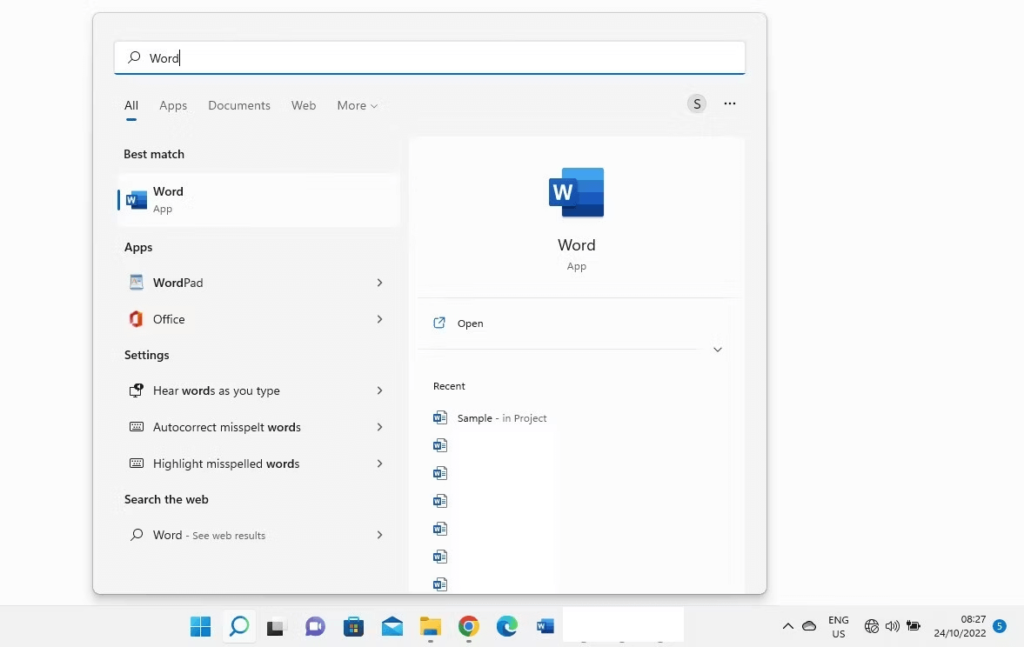 步驟一:導航至Windows 搜索和輸入應用程序的名稱查看該應用程序最近打開的文件。您可以通過單擊搜索結果右側窗格中的相同項目來訪問該應用程序中最近打開的所有項目。