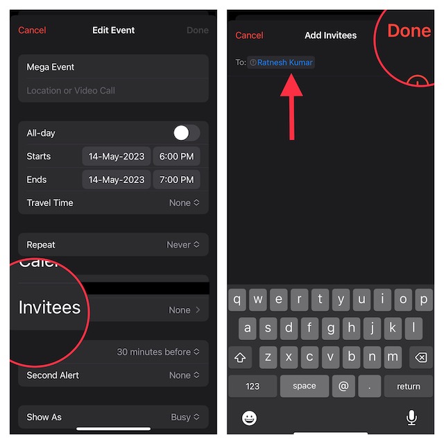 - 稍後,如果您想邀請更多人參加活動,請點擊添加邀請 -> 輸入該人的電子郵件地址,然後點擊完畢。