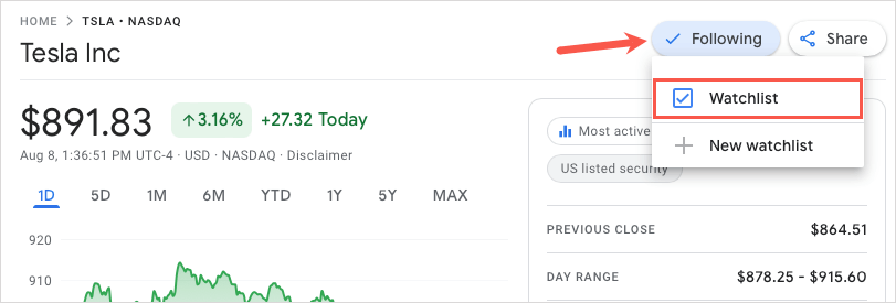 為了快速、輕鬆地跟踪您感興趣的證券,您可以將它們添加到 Google 財經的觀察列表中。除了實時查看股票市場數據外,您還可以查看與您關注的股票相關的財經新聞。