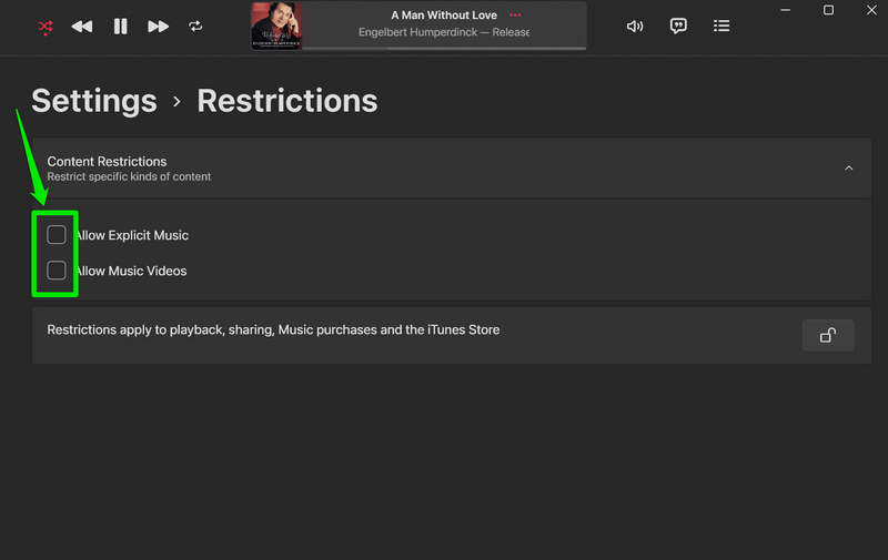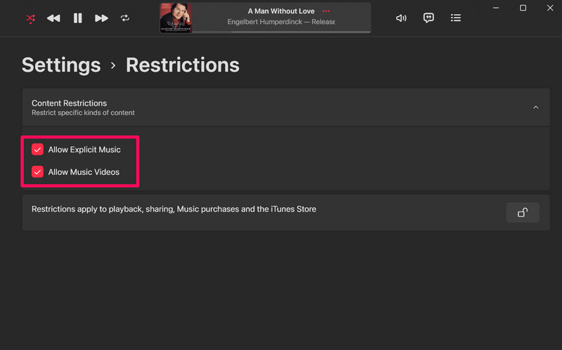 筆記:如果選中“限制”選項的框,則意味著 Windows 11 上的 Apple Music 應用中允許存在露骨內容。