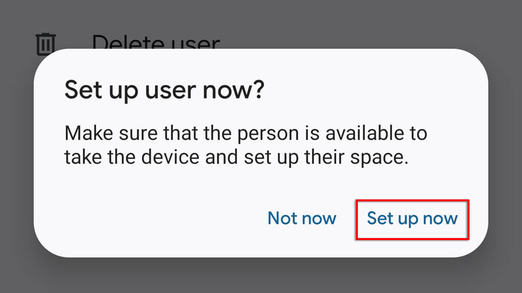 - 現在會出現一個彈出窗口,要求您設置用戶。選擇立即設置並貫穿整個過程。您必須登錄或創建 Google 帳戶並選擇鎖定 PIN 碼或指紋。