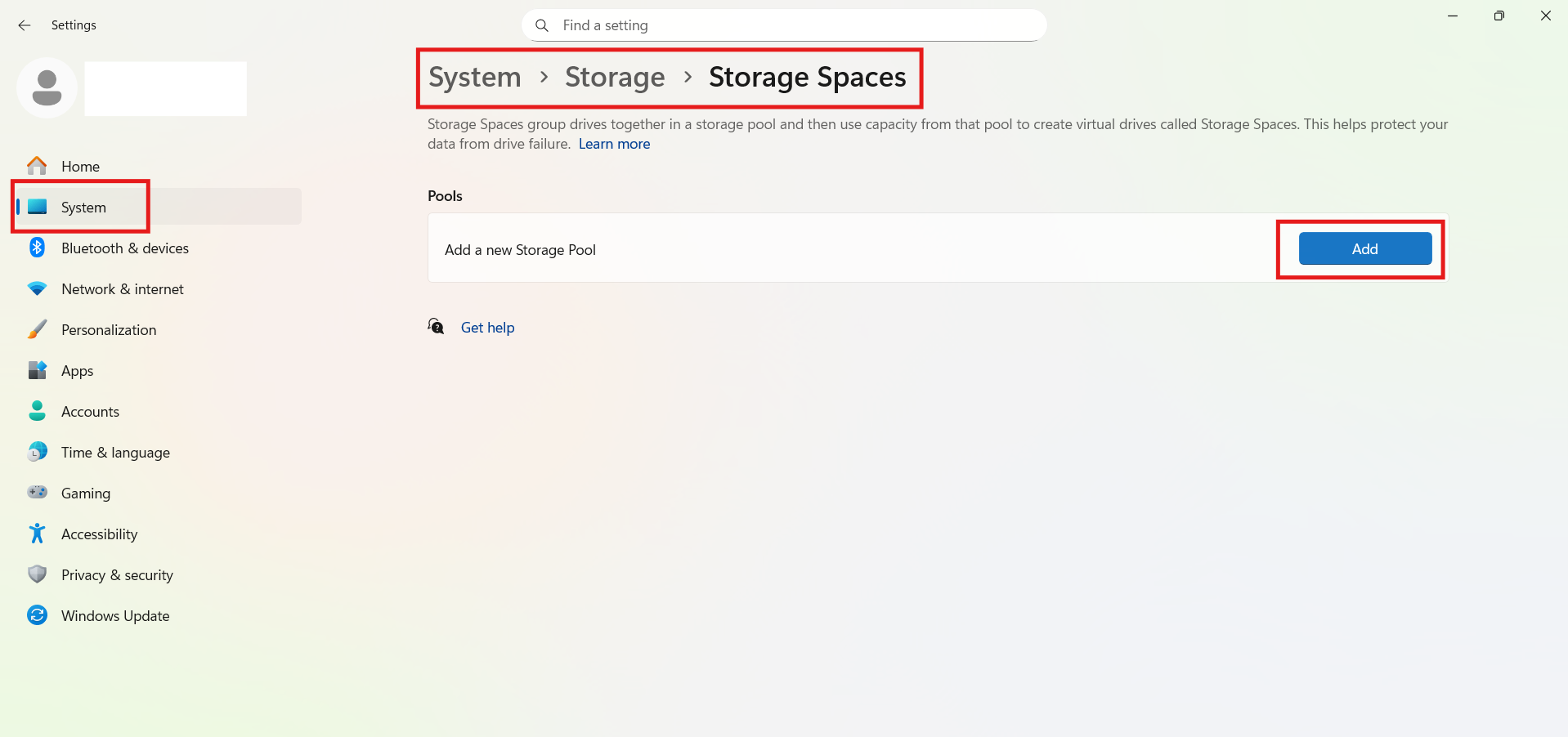 2. 選擇存儲空間,然後選擇添加新存儲池和存儲空間。