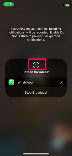 6.屏幕共享將在之後開始3秒倒計時在 WhatsApp 視頻通話中。