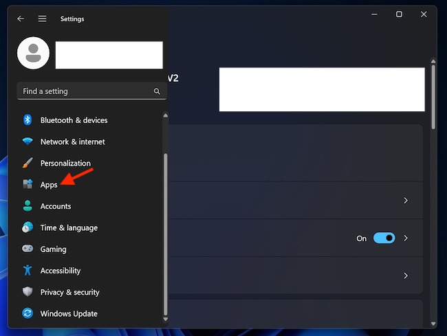 - 當您在“設置”菜單中時,選擇"應用程式"在左側邊欄中。