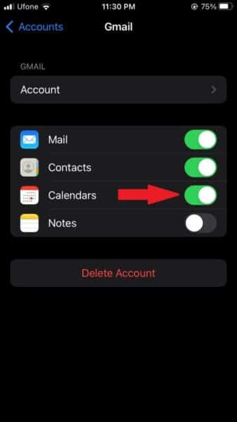 - 然後打開開關日曆。這樣可以將您的 Google 日曆事件與 iPhone 的內置日曆應用程序同步。系統可能會提示您允許 Google 日曆訪問您的 iPhone 日曆。輕敲允許授予許可。