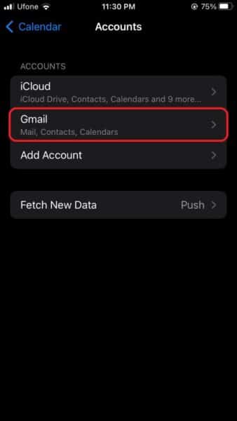 - 在“帳戶”設置中,如果您已將帳戶添加到 iPhone,請點擊 Gmail,如果沒有,請點擊添加賬戶。將顯示支持的帳戶類型列表。