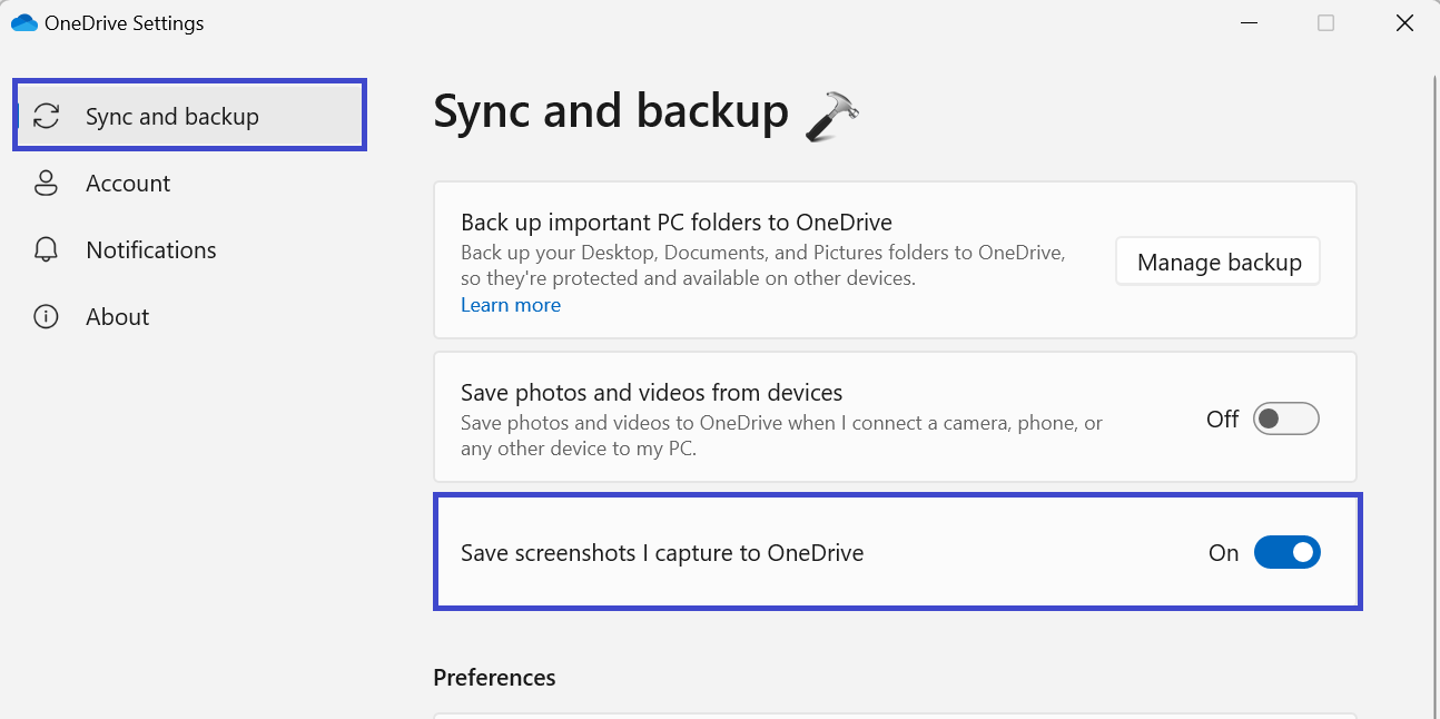 3. 將出現一個對話框。導航至“同步和備份”,然後打開“將我捕獲的屏幕截圖保存到 OneDrive“ 選項。