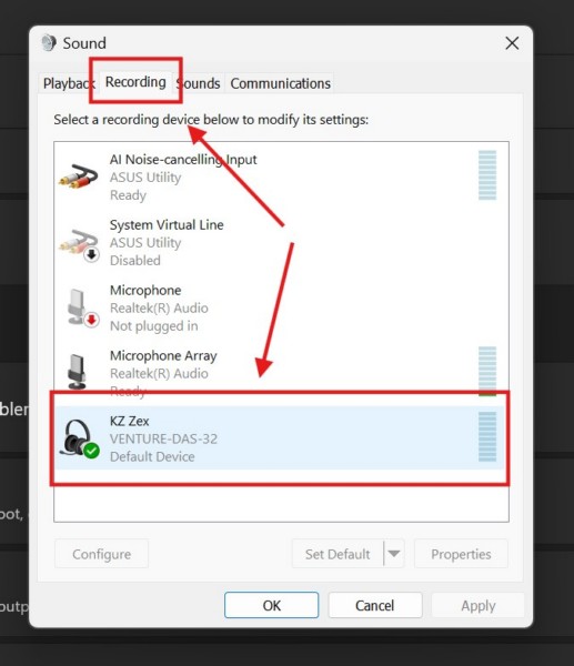 4.在下面的窗口中,轉到錄音選項卡從上面的部分和在列表中找到麥克風。
