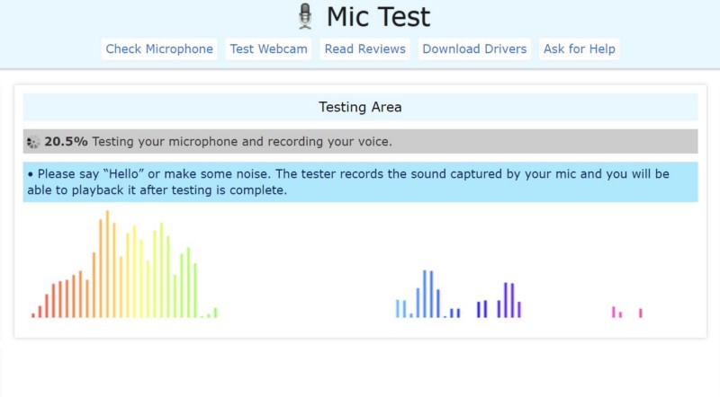 6.測試期間,您可以對著麥克風說話或播放音頻來記錄它。當麥克風錄製音頻時,您還可以看到動態可視化。
