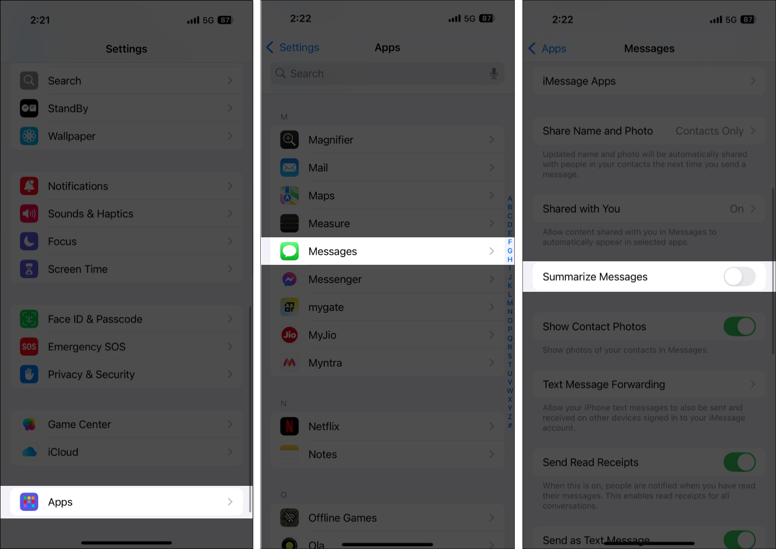 例如,您可以通過前往“消息”應用程序通知來關閉文本摘要設定→應用程式→留言並關閉總結消息。