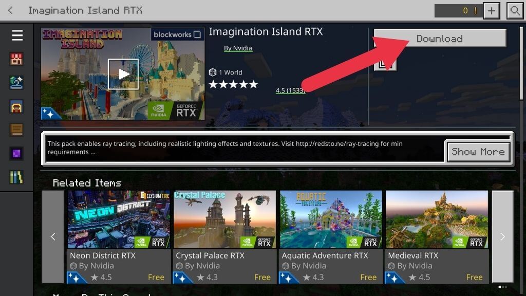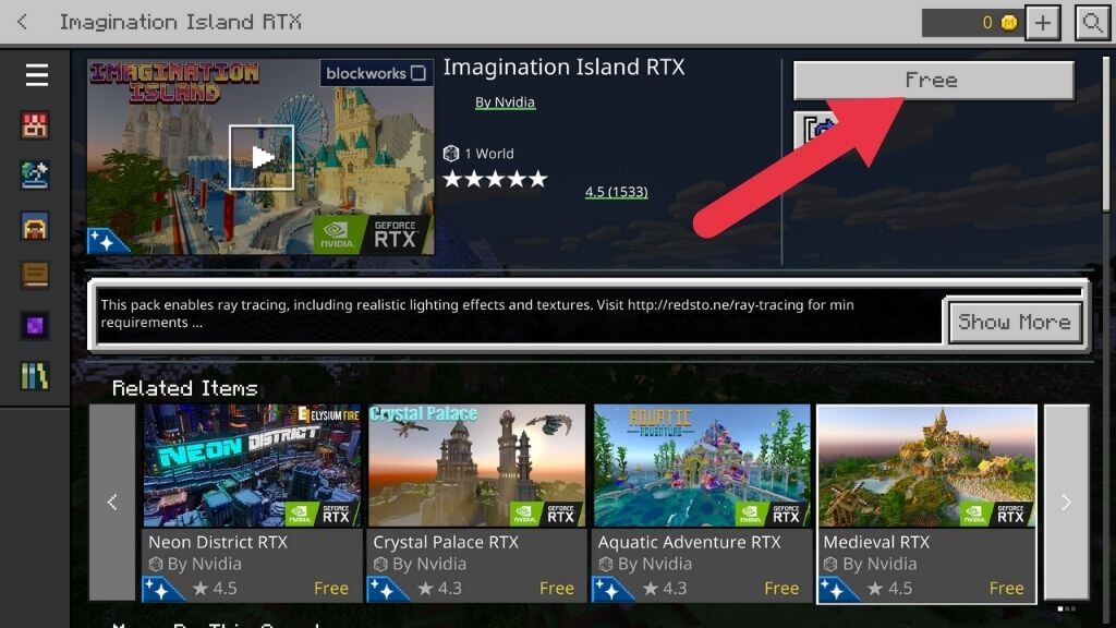 - 在本教程中,我們將使用 Imagination Island RTX。選擇顯示以下內容的按鈕自由的領取包裹。然後等待購買完成。