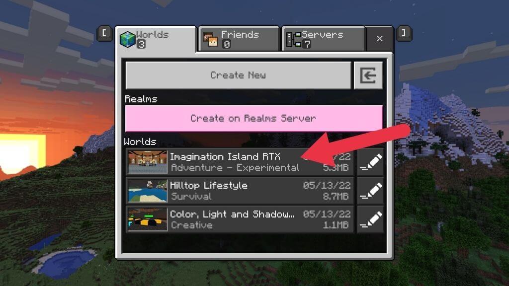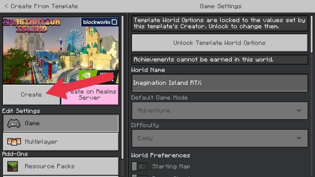 - 下載完成後,選擇創造這個世界!然後,選擇創造或者在 Realms 服務器上創建如果您想進行在線會議。